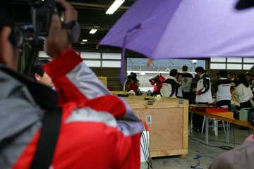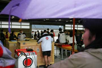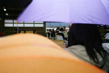 | 雨の中、傘の合間より撮影開始。 | 松本さん発見。 琢磨さんも居るのか?。 |
