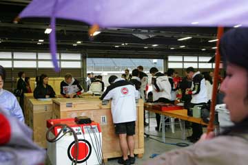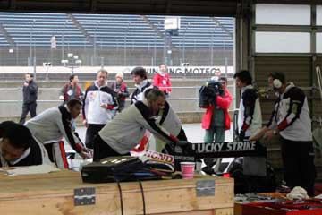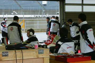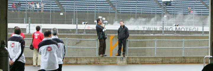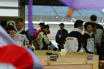 | 行って来ました、Enjoy Honda MOTEGI 2004。 鈴鹿から帰宅後忙しい日々で参加が危ぶまれましたが、軟弱な心は誘惑に耐え切れず参加しました。 しかし!、そんな気持ちをあざ笑う様な無常の雨、果たして無事に開催するのか?。 不安な思いを胸に・・・10月30日深夜25:00にヘ○メットさんとい○らんさんと集合し、続いてト○ルさんの待つ日野市に向かい、合流していよいよもてぎに向けて出発!。 途中道に迷いながらも6時頃にもてぎに到着、先発組みと連絡を取りながらゲート・オープンを待つ。 予定された7時を前にゲート・オープン、正面に近いP4に駐車し先発組みの待つグランド・スタンドへ! 先発組みと合流後は暫し歓談、そんな中・・・8時過ぎピット付近に異変を確認、琢磨さん登場?。 急いでパドックに向け出発。 パドック裏に到着するが大変な人だかり、傘の合間からピット内を窺う。 |