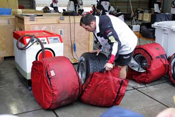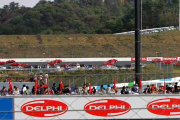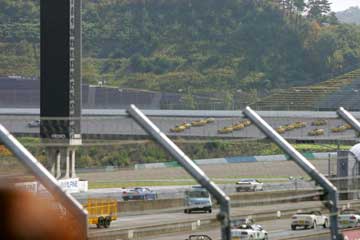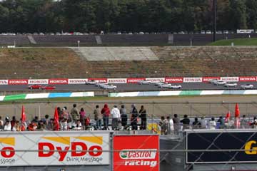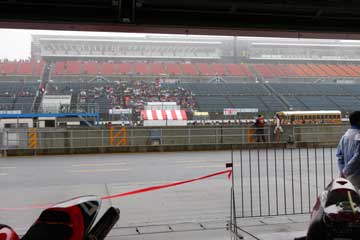 | 午後はドライ?、レイン・タイヤは一先ずお休み。 | ピット裏から見たスタンド、鈴鹿での応援旗がここにも。 |