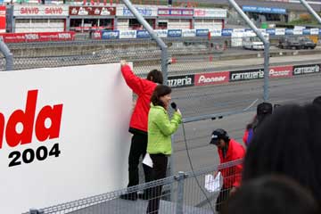 | しゃがみ込む佐藤里佳アナを残して、佐藤琢磨は一旦退場・・・???。 | |