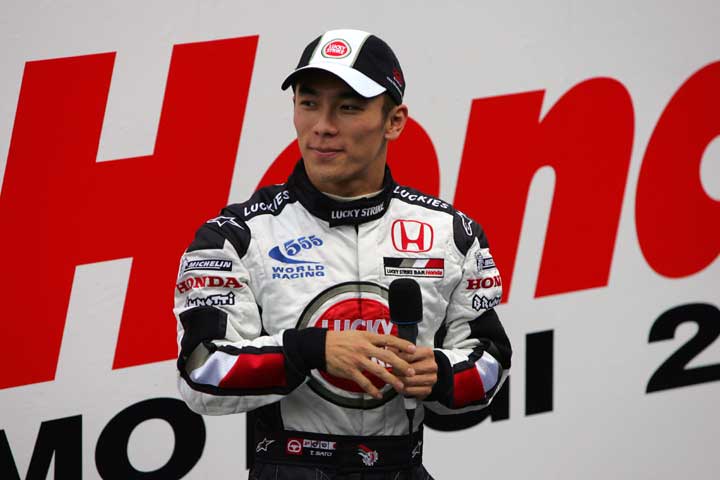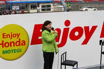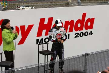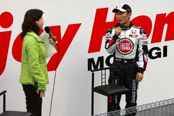 | 準備完了まで待機する佐藤琢磨。 | 改めて佐藤里佳アナから紹介。 |