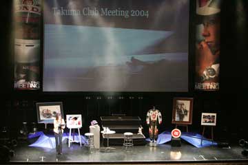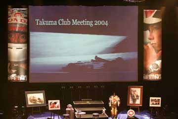| 鈴鹿から帰宅後は毎日忙しい日常、観戦記の更新も出来ない日々が続いている。 それでも先日は Enjoy Honda MOTEGI 2004 に参加、そして今度は Takuma Club Meeting 2004 だ!!。 シーズン・オフに琢磨さんに会える数少ないチャンス!、チケットは真っ先に購入したが・・・。 風邪で体調不良、仕事が忙しく休めず金曜日には体調最悪、土曜日は一日寝て過ごし回復を図る。 イベント当日の日曜日の朝、多少は良くなった気がするので出発の準備開始、でも間に合うのか?。 予定した時間を大幅に過ぎて出発、急いでイベント会場に向かう、体調は相変わらずだ。 何とか無事に最寄の駅に到着、急いで会場に向かう、もう集合して入場順番待ちの時間を過ぎている。 駅前でイベントに参加するらしい集団に遭遇、見れば顔見知りの方々、一緒に会場に急ぐ。 会場周辺では既に入場待ちの行列が出来ている、幸いな事に先着順では無く整理番号順に並ぶ・・・。 あっ、整理番号は600番台、やっぱり後ろの方でした。 (T_T) 入場待ちの間に次々とお馴染みの方々と再会、やはり今日は琢磨さんファンは全員集合ですね!。 暫らくして入場開始、やっとの事で順番が回って来るがステージ前は既に満席、諦めて2階席に向かい、 居酒屋『琢磨』のうりぼうさん達とご一緒する、ステージからは離れているが、その分見晴らしは良い。 程なく会場が暗くなり正面スクリーンにビデオが流れ始める、イベントの開始だ!。 |