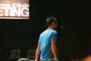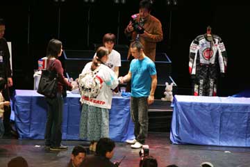 1000人ものファンと握手をするのは大変、琢磨さんのファンに対する思いに感謝します。 2階席まで順番が回るのは当分先の事、少し休憩して先に握手の済んだお仲間の所で歓談。 席に戻ると今度は来客登場、静岡から来た静岡蜜柑さんだ!、お土産の貴重なビデオを頂き暫し歓談。 暫らくしてやっと2階席に順番が回って来る、もう直ぐ生琢磨さん!。 |