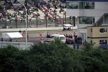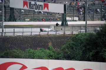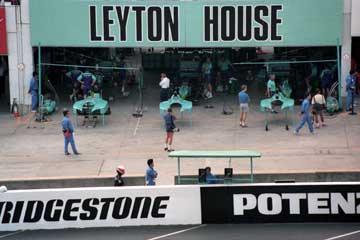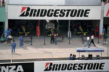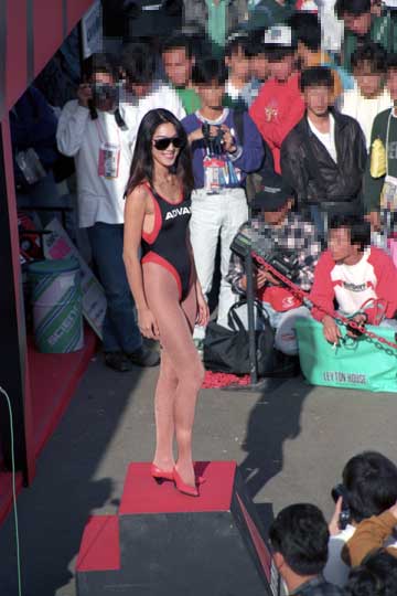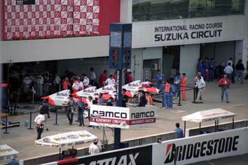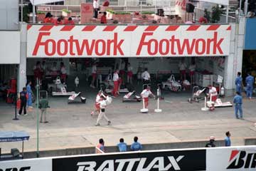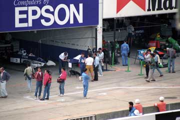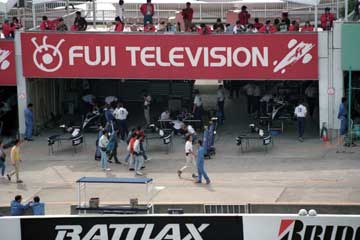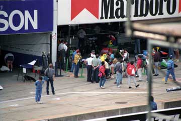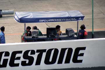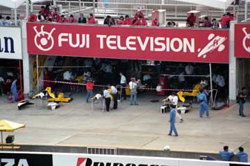 | ピット・ウォールに設置された司令塔もテントの時代。 | 最新式モニター (^^; を見守る亜久里とベルナール。 |