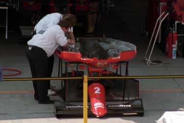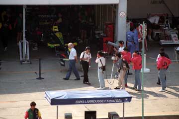| 予選に向け作業が続くマクラーレンのピット。 | フェラーリの車載カメラを整備するFOCAカメラクルー。 |