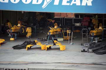 | 撤収作業が進むピット内、輸送専用の幅狭のタイヤを装着している。 | |