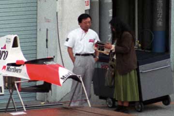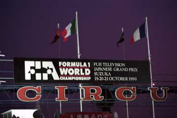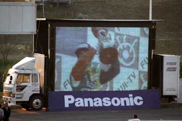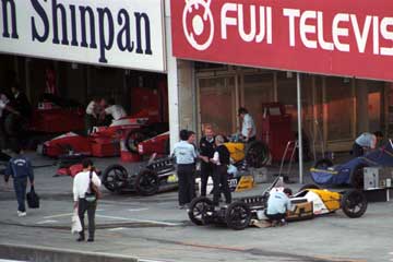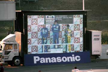 | ピットの傍らのサーキット・ビジョンで、レースの再放送が行われ、鈴木亜久里の表彰台の映像が流れていた。 | |