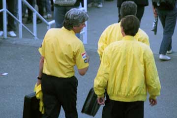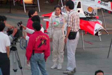 | 来期移籍するウィリアムズ・スタッフと歓談するマンセル。 後では佐藤里佳アナの中継準備中。 | |