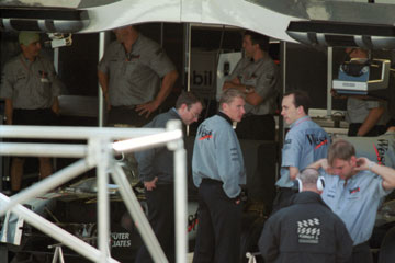 | 朝8時頃目覚める、早速車外に出てバンパーを確認、やっぱりへこんでる!、やっぱり夢じゃ無かった!。 ゆっくり歓談しながら10時頃まで朝食を摂る。 話題はやはりチャンピョン争い、前戦のマレーシアGPでの見事なミハエル・シューマッハーの復活、その後の失格騒動・・・お約束の様なフェラーリ寄りの裁定、話は尽きない。 食事が済み車の目隠しをした後、グランド・スタンドまで出かける事にする。 木曜日は未だレースは始まらないが、グランド・スタンドでピット作業が観戦出来る。 これが楽しみで、水曜日にサーキット入りしたのだ。 グランド・スタンドに着くと早速ピットを見学。 当然最初はフェラーリの前に陣取る。 |