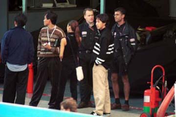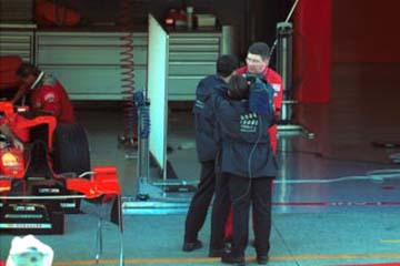| 撮影が終わってメカニックと話すアレクサンダー・ブルツ。 | かつてベネトンのメカニックであった津川哲夫さん、情報収集。 |