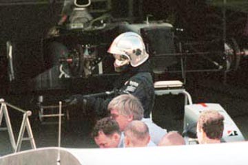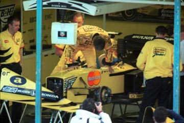 | レーシング・スーツに着替える、デーモン・ヒル。 | 壁のスズメバチがお茶目なジョーダンのピット、上位陣に一刺し出来るか?。 |