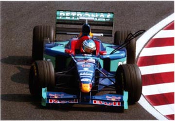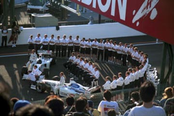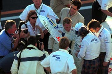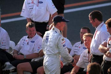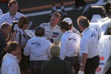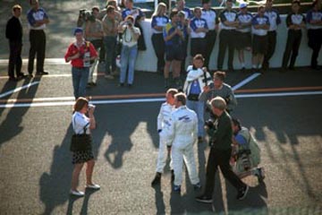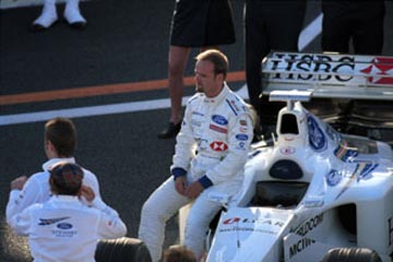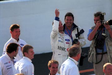 | ジョニー・ハーバートはチームスタッフに挨拶。 | ルーベンス・バリチェロはスタンドの歓声に応える。 |