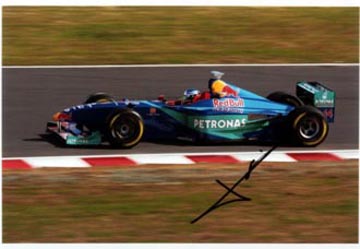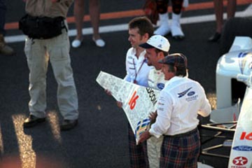 | 来期はフェラーリ・ドライバーとなるバリチェロは、神妙な表情。 | ジャッキー・スチュワートから、寄せ書きされた記念品のプレゼント。 |