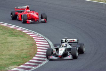 デビッド・クルサードに頭を抑えられたエディ・アーバイン、早めに2度目のピットインを決行。 その直後デビッド・クルサードがスプーン・コーナーでスピン!。 緊急ピットインしたデビッド・クルサードは下位に沈む・・・が、2度目のピットインを終えたミハエル・シューマッハーは周回遅れのデビッド・クルサードの後ろに付く事になる。 デビッド・クルサードの絶妙な援護?でレースの行方はミカ・ハッキネンのものに。 終盤の43週目、高木虎之介がメイン・ストレートでスローダウン、さらにその後方を走行していたルカ・バドエルのマシンが豪快にエンジン・ブロー共にリタイアとなる。 |