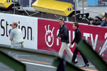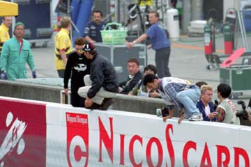 ジョーダンのピットには引退を表明したデイモン・ヒルが現れる。 直ぐ前のスタンドに陣取ったファンからの声援に応えて、デイモン・ヒルが最後の挨拶を行なう。 |