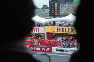 | レース終了後の帰宅ラッシュの中、グランド・スタンドに移動しピットの様子を見学する。 マクラーレンのピット前を目指して移動中、フェラーリのスタッフがコンストラクターズ・チャンピョン獲得を祝っているのに気付く、急遽撮影開始。 |