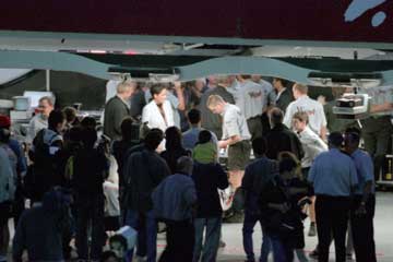 | ミカ・ハッキネンの登場で盛り上がるスタンド、ピット内に戻った後もさらに盛り上がる。 |