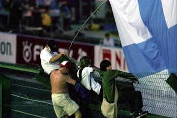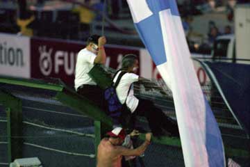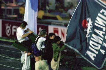 | 【フェンスに登らないで下さい!】場内アナウンスも虚しく、盛り上がるファンは増えるばかり。 | |