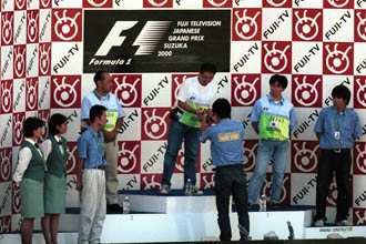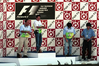 | 小さな優勝カップを受け取る、ウイナー。 | ミネラルウォーターでのシャンパン・ファイト?。 グランド・スタンドからも、大きな歓声を受けていた。 |