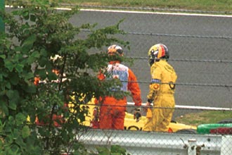 | 20周目のS字コーナー。エンジンブローで、ジャン・アレジがリタイア。 | 観客に手を振りながら退去する。 |