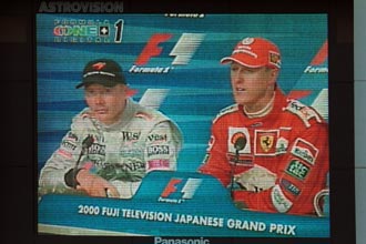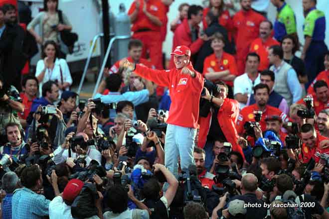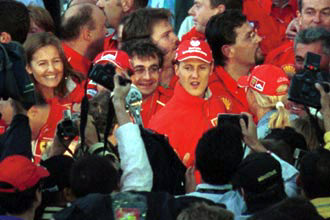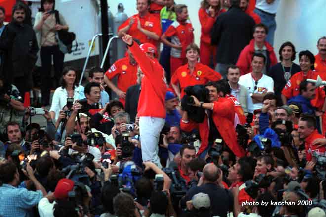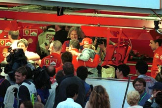 | 優勝インタビューを受ける、ミハエル・シューマッハー。 | その間、スタンドの声援に応えるチームスタッフ。 |