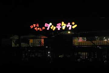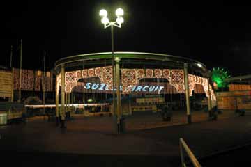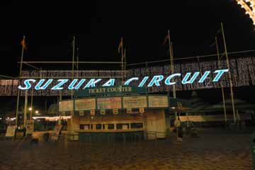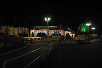 プロローグ 又この季節がやって来ました、待ちに待ったF1日本GP、鈴鹿が俺を呼んでいる!。 例年準備が遅くなり中々出発出来ない事が多いので、今年こそは早めの準備と思いつつ・・・。 6日にはお台場でのTOYOTAのイベントに行って準備出来ず。 でも、おかげで気分は早くもF1モード全開!!!。 10月09日 前日の深夜まで荷物の準備したので今日は余裕で出発?、・・・はい、寝坊しました。(^^;; 車に荷物の搬入が終わり、それから出発を各所の掲示板に報告したら、もうお昼前。 早目に食事を摂り12時半に出発、【早く着く事】より【確実に着く事】を心掛けて400キロの道程を行く。 18時前に東名阪の鈴鹿ICに到着、その後に最後の買出しを行い、いざサーキットへ!。 18時半に駐車場に到着、急いで停車場所を物色するが、良い場所は既に先行車で一杯だった。 兎に角場所を決めた後、夕食を摂りながらビールを飲む、美味い・・・もう一本。 落ち着いた所で周辺を散策開始、味の街へ行くが余り人影無し、そこで今度はサーキット入口へ行く。 !あれ?!、ライト・アップされてる!、昨年までは無かった気がする、先ずはこれから。 |