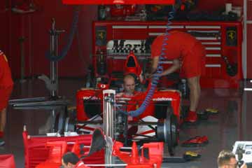 当初S1エリアで見学していたが、フェラーリのピットで動きが在る様子。 早速フェラーリのピットが有る1コーナー寄りのS2スタンドに移動開始。 しかし、フェラーリの正面のスタンドとは繋がっていない、急いで移動したが到着時にはタイヤ交換の練習は既に終了間際、残念。 |