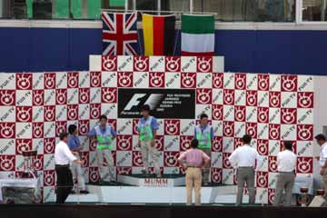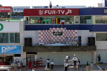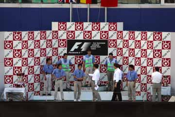 | 代役のオフィシャル達が表彰台に上がる。 後ろのセットは未だ昨年のままだ。 | |