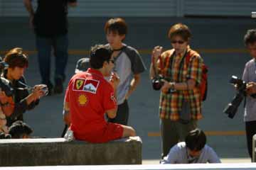 | 観客が止めたフェラーリのマシンに注目するのに、無視して何かしている。 良く観ればアイスクリームを食べてます。(^^) | |