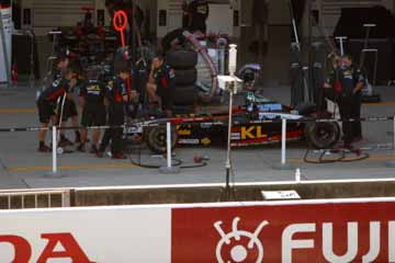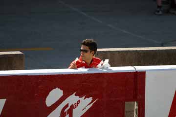 ミナルディのピットに動きが、どうやらピットインの練習を始めるらしい。 場所を少し移動して見やすい席を確保するが中々始まらない・・・。 その内に、今度はジョーダンも練習を始める様子、さらに移動してこちらを見学する。 |