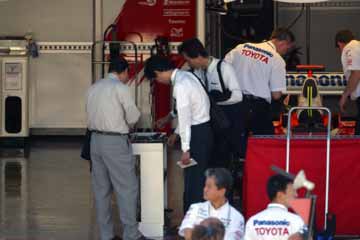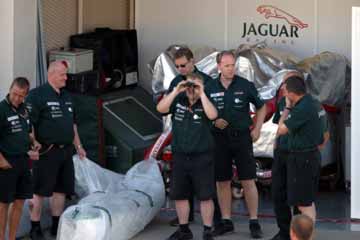 | TOYOTAのピットに訪問者、スーツ姿とは・・・トヨタらしい?。 | 何を見るのかジャガーのスタッフ。 |