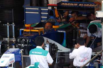 グランド・スタンドを通り抜けるドライバー、周辺のファンが騒ぎ出すが・・・誰だっけ?。 見覚えが在るが・・・、現ルノーの2人じゃない・・・、見覚えのある顔だが・・・。 そうだ!テスト・ドライバーのフェルナンド・アロンソだ!、誰だか気づいた時には既に遠くに・・・。 |