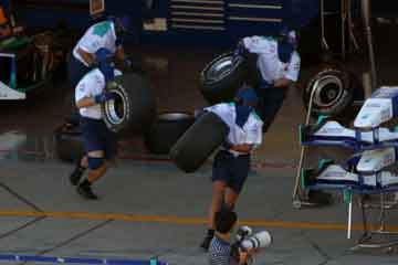 今度はザウバーのピットイン練習が始まる。 しかし、右前輪担当のメカニックが変・・・、何とカツラを付けての練習だ。 この2人はピット奥から現れた時には、スキップをしながら登場していた。(写真撮れませんでした。) |