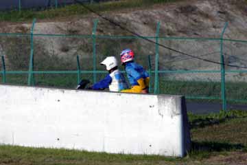 | スタンドの声援の応えるバトン。 | 既に予選終了、マシン排除も行わないオフィシャルと歓談。 |