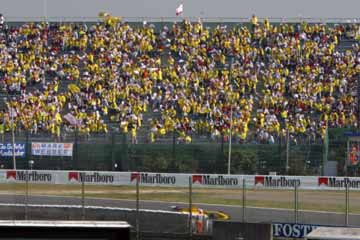 | Dスタンドの専用応援席の前を爆走する佐藤琢磨、今日もHONDAエンジンいい音を奏でる!。 | |