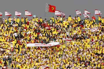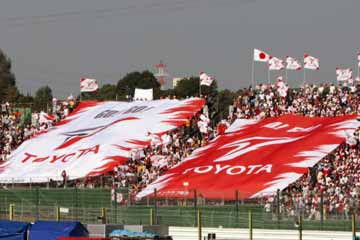 | 気合十分のトヨタ応援席。 | こちらは、フェラーリの旗が輝くHONDA応援席。(^^;; |