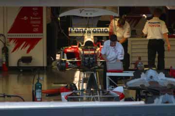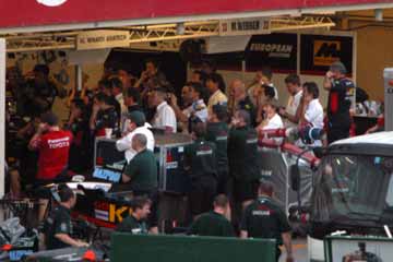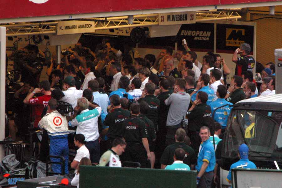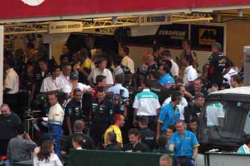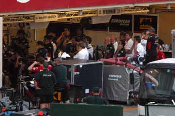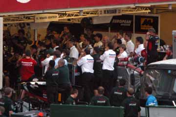 | そんな中、ミナルディのピットでは『 聖者の行進 』の再演が始まる。 始めは少なかった観客も・・・。 | |