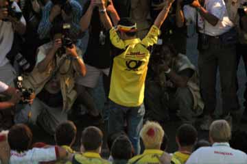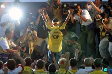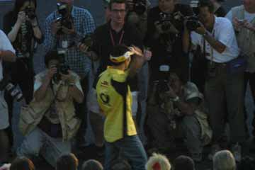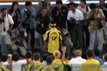| いよいよ佐藤琢磨が登場、グランド・スタンドからの大声援に応えながら歩み寄る。 | |