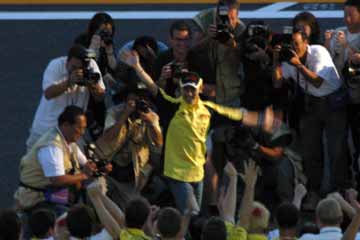 | 満面の笑みでグランド・スタンドのファンに挨拶する佐藤琢磨。 | |