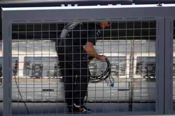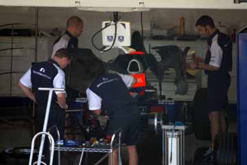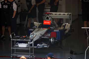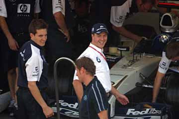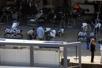 ウイリアムズのドライバー2人は、同じリラックスした様子でも個性が現れる。 陽気なモントーヤに対して、真面目そうなラルフ、こんな光景が見られるので木曜日はお勧めなのだ。 隣のマクラーレンは淡々と作業を行っている、ドライバーの姿も無くつまらない・・・、ネタが無い!!。 |