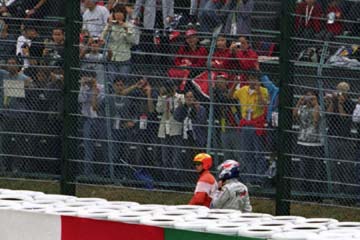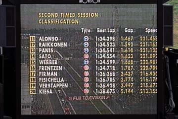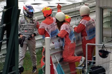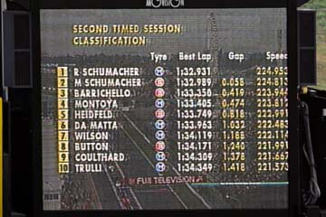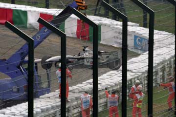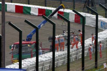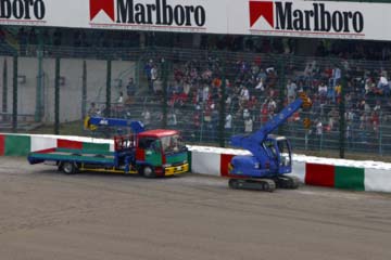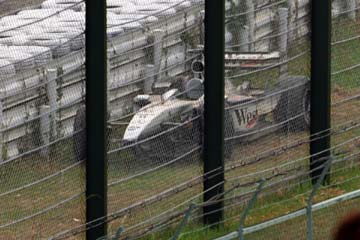 | 9時にフリー走行開始、午後の予選2回目に向けて各車が走行を続ける。 そんな中、ミハエル・シューマッハーの唯一のライバルである、キミ・ライコネンが2コーナーでクラッシュ。 |