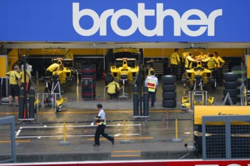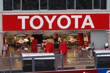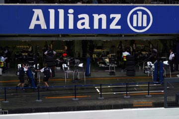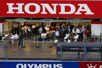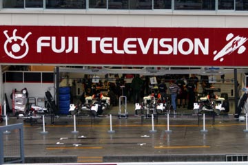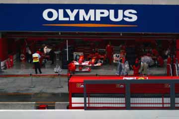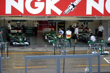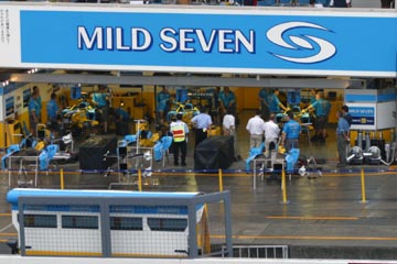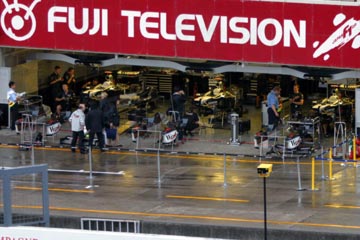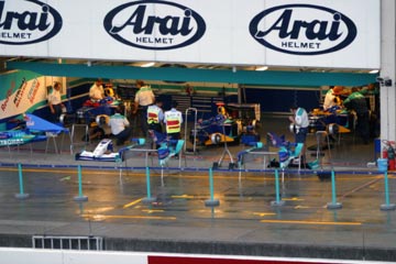 | 雨の中のピット。 ???マシンの整備をしている!、禁止じゃないの???。 | |
