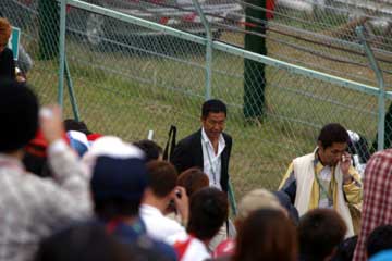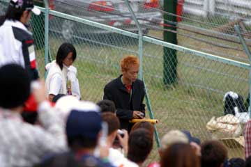 | 今日もE2スタンドのゲストは脇坂寿一と土屋圭市、大勢の観客の歓声の中登場。 | |