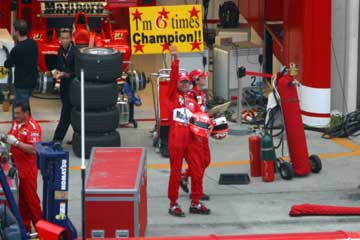 | 感動した佐藤琢磨の凱旋を見た後は、フェラーリのピット前に場所を移す。 早速、チャンピョンのミハエル登場・・・何か変だな??、カメラマンの記念撮影に呼ばれたファンか?。 |