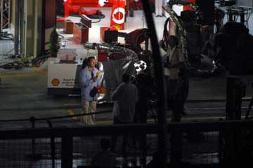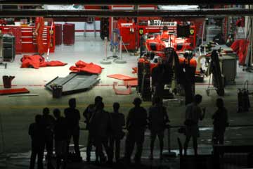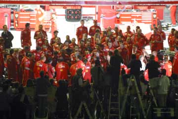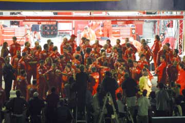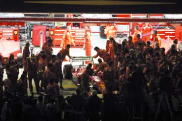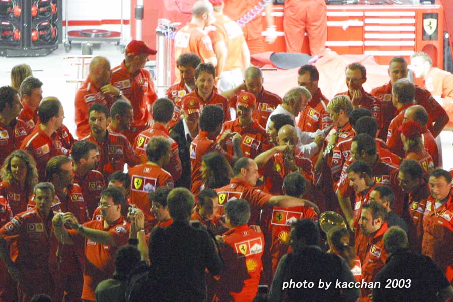 明かりの中のフェラーリ・スタッフは皆笑顔、その中にミハエル夫妻の姿を確認。