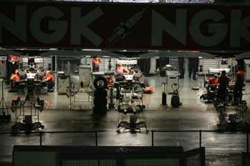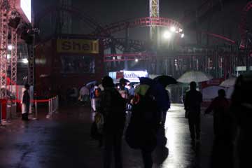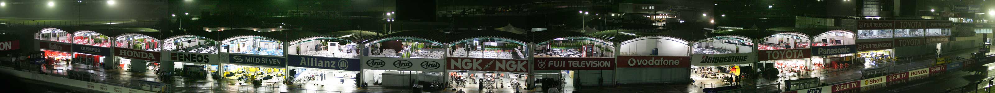 | フリー走行終盤から降り始めた雨で一時車まで撤退したが、17時半過ぎに再びサーキット正面ゲートに向う、F○速報主催のけ○さ○祭りに参加する為だ。 毎年金曜日の夜に参加しているが、昨年は台風騒動で中止、今年は2年振りの開催でとっても楽しみ。 集合場所に赴き同行者と合流、顔見知りに会い挨拶を交わした後、受け付け開始まで待機。 しかし次第にお腹が空いてくる、急いで園内の売店に向うが既に閉店・・・、悩んだ末車まで戻り食料を調達する、祭りを見学中に食べよう。 (^^; 暫らくして受け付け開始、並んで進むと!、・・・受付は顔見知りの方達!、何で?、一般人だったよね。 受付を済ますと全員の受け付けが終るまで待機、その後やっと会場に移動する。 今まではS1席だったが今年は?、到着するとやはり新グランド・スタンド下のV席だ。 入場時には黄色いタオルのプレゼント付き、何故?。 席を確保するとさっそく食事。 (^^;; その後、落ち着いたので夜のピットを撮影する。 |