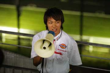 け○さ○さんの挨拶で祭りの開幕。 そしてプレゼントした黄色いタオルの説明、FDに参戦している松下選手の応援用だった。 最初のゲストは、その松下選手。 |